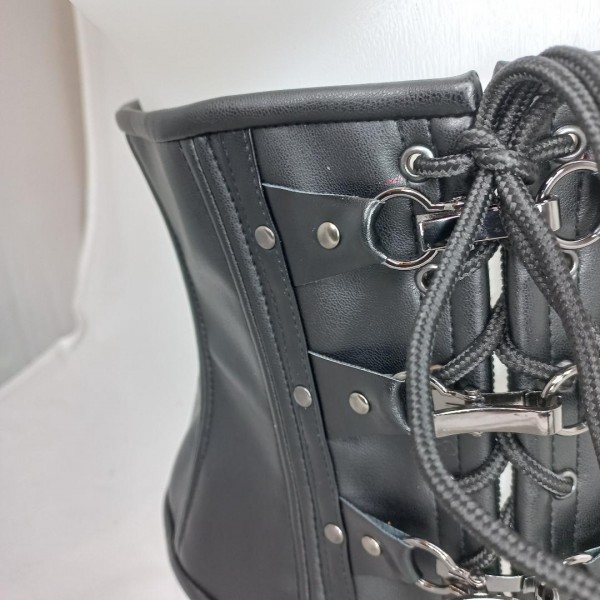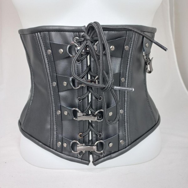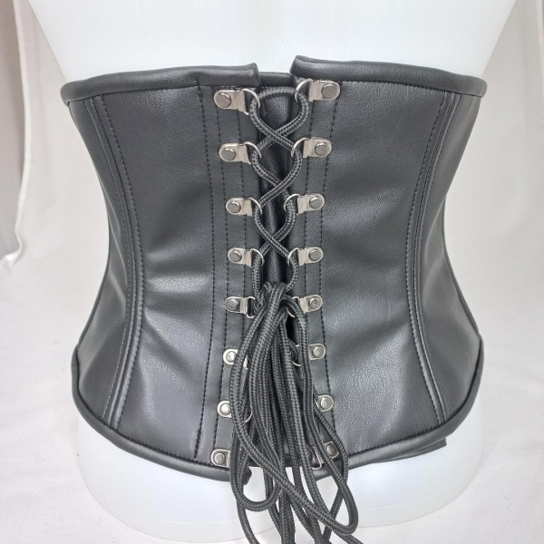 Serre taille en skai et imitation cuir, lacé devant et dos, avec attaches crochets et rivets.
